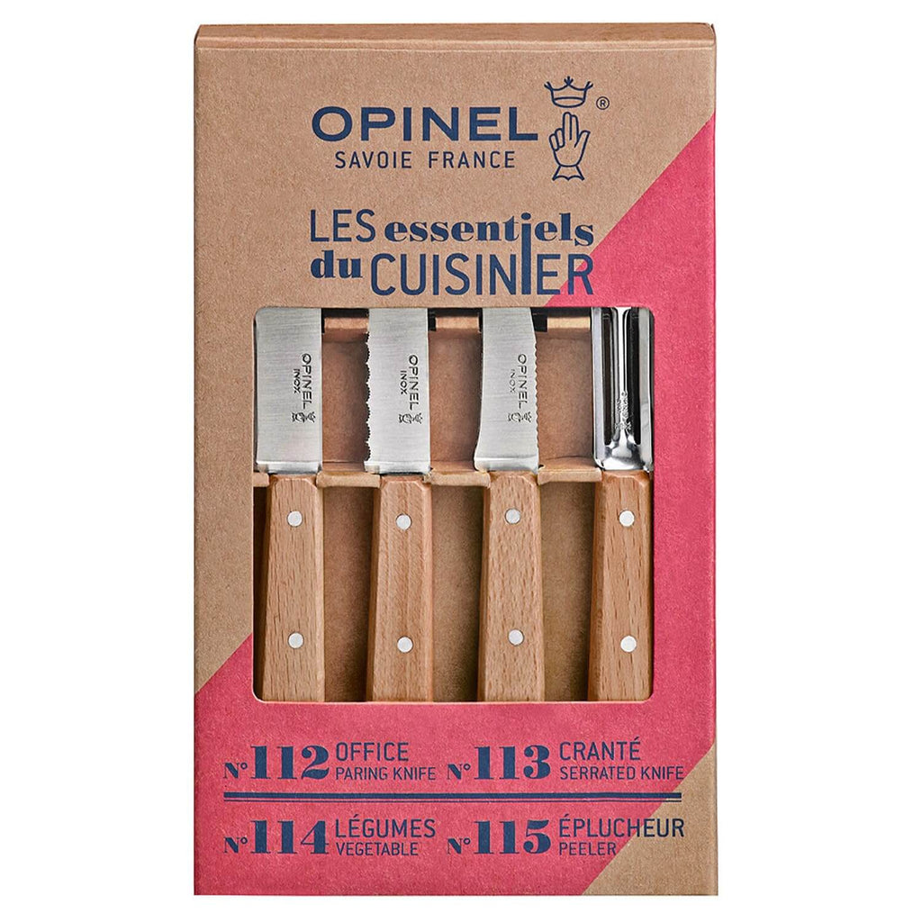 Hol dir das Opinel Estuche de Esenciales – das praktische 4-teilige Küchenmesser-Set mit Holzgriffen für alle Basics in der Küche.