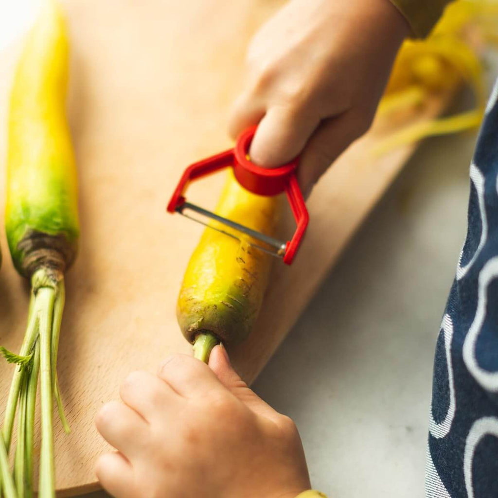 Dank der robusten Materialien und der kindgerechten Form ist der Sparschäler langlebig und praktisch. So können Kinder spielerisch ihre Kochfähigkeiten entwickeln – immer unter Aufsicht von Erwachsenen.