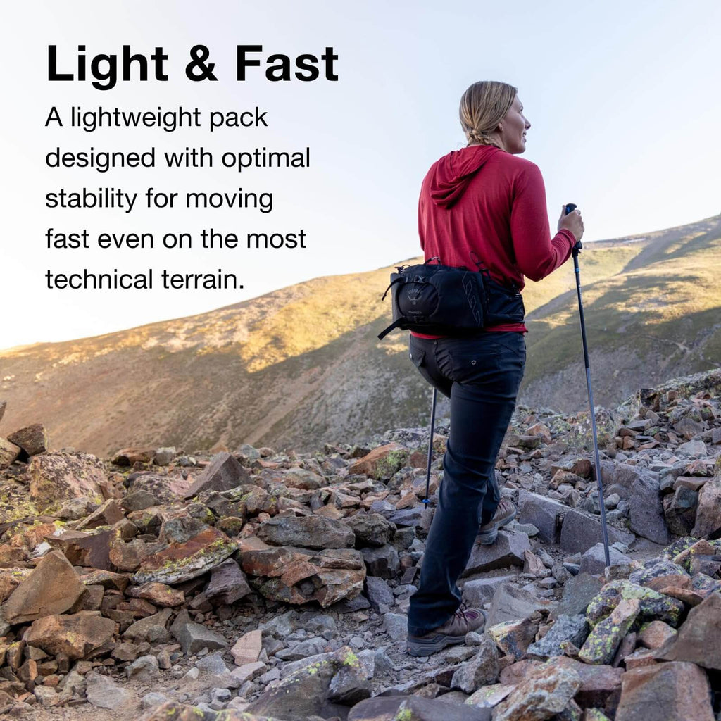 Die Osprey Talon 6 in Stealth Black ist die ideale Hüfttasche für Trailrunner, Wanderer und Radfahrer, die Wert auf Leichtigkeit und Bewegungsfreiheit legen. Mit einem Volumen von 6 Litern bietet sie Platz für zwei Trinkflaschen, eine leichte Jacke und Snacks. Das AirScape™-Rückenpanel sorgt für optimale Belüftung, während der BioStretch™-Hüftgurt einen stabilen Sitz gewährleistet. Hergestellt aus bluesign®-zertifiziertem, recyceltem Nylon mit PFC-freier DWR-Beschichtung ist sie zudem umweltfreundlich.